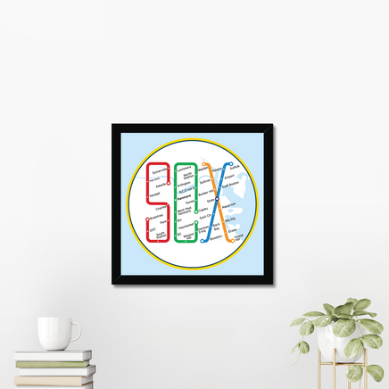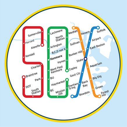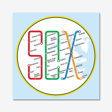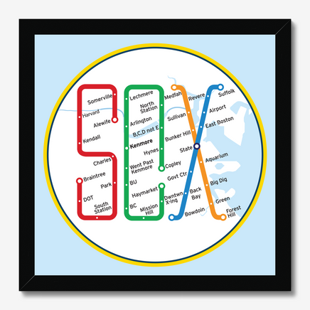 Celebrate your love for the Boston Red Sox and the iconic MBTA with "The T" Boston Red Sox Artsy Farsty Art Print! This print comes in three sizes, 8" x 8", 10" x 10" and 14" x 14", displaying the word "SOX" designed in the shape of the famous Boston MBTA system. Complete with stops!